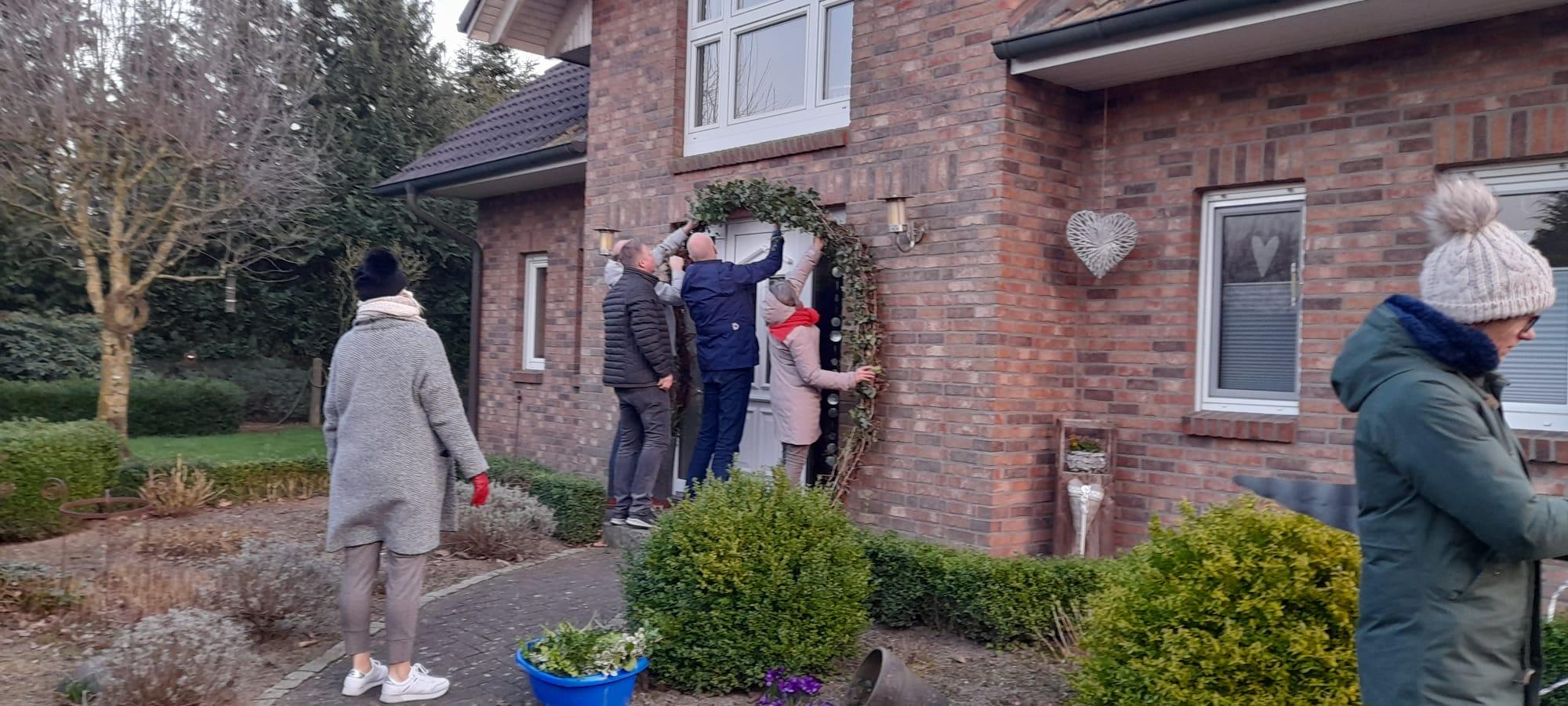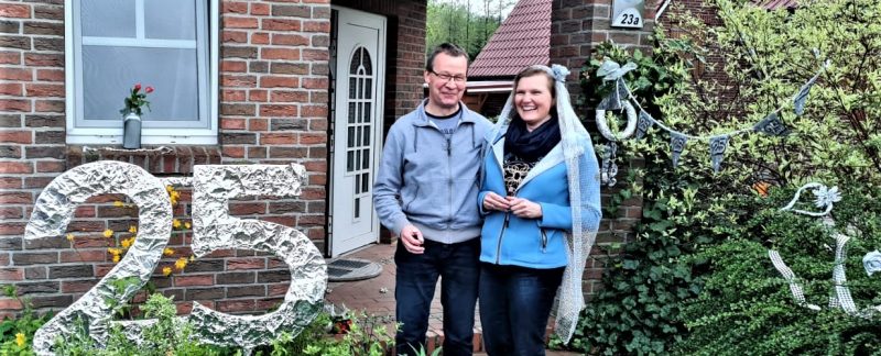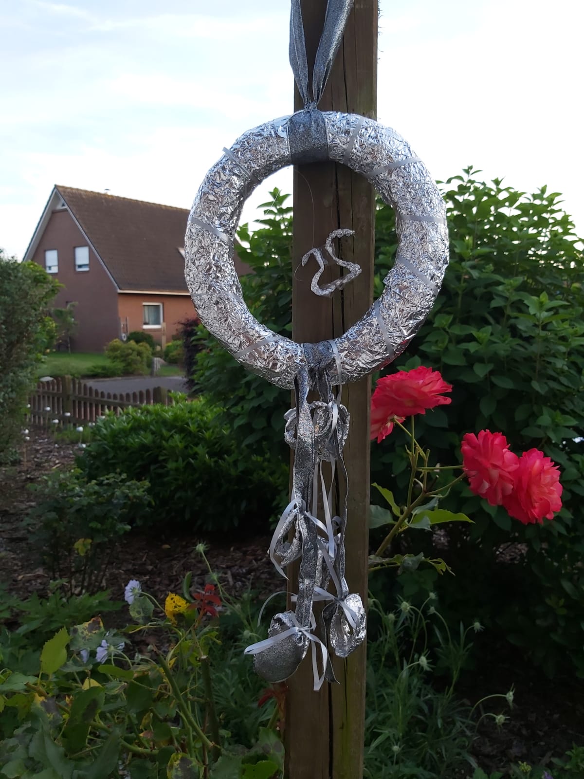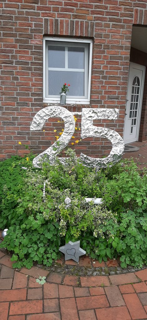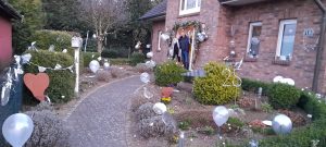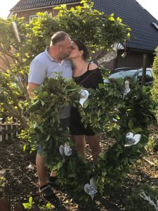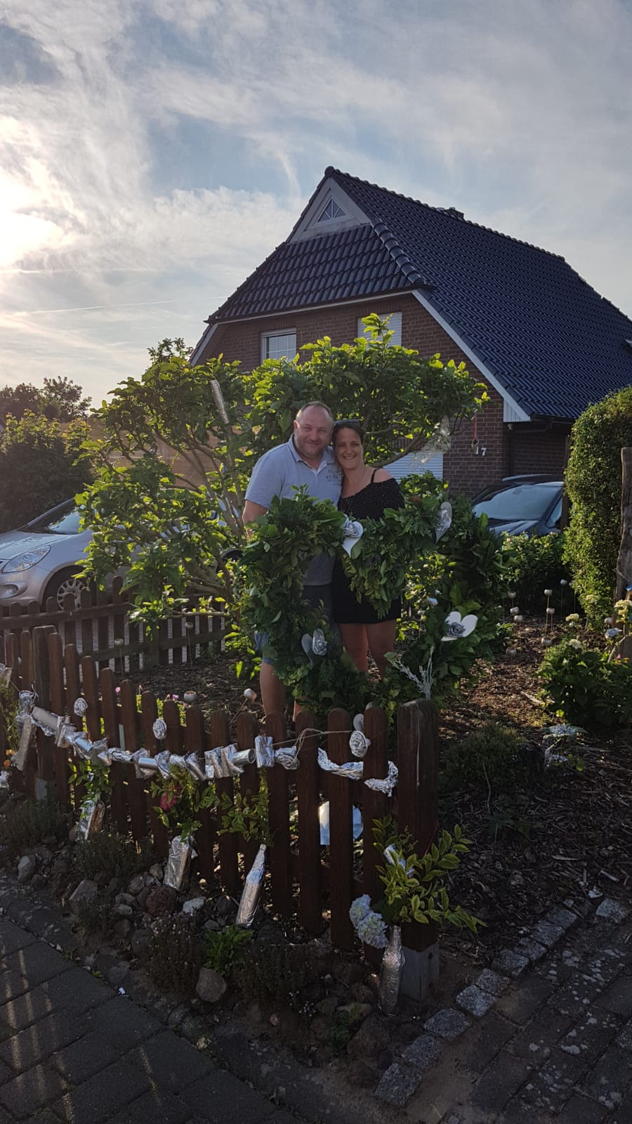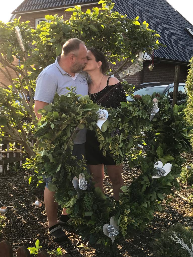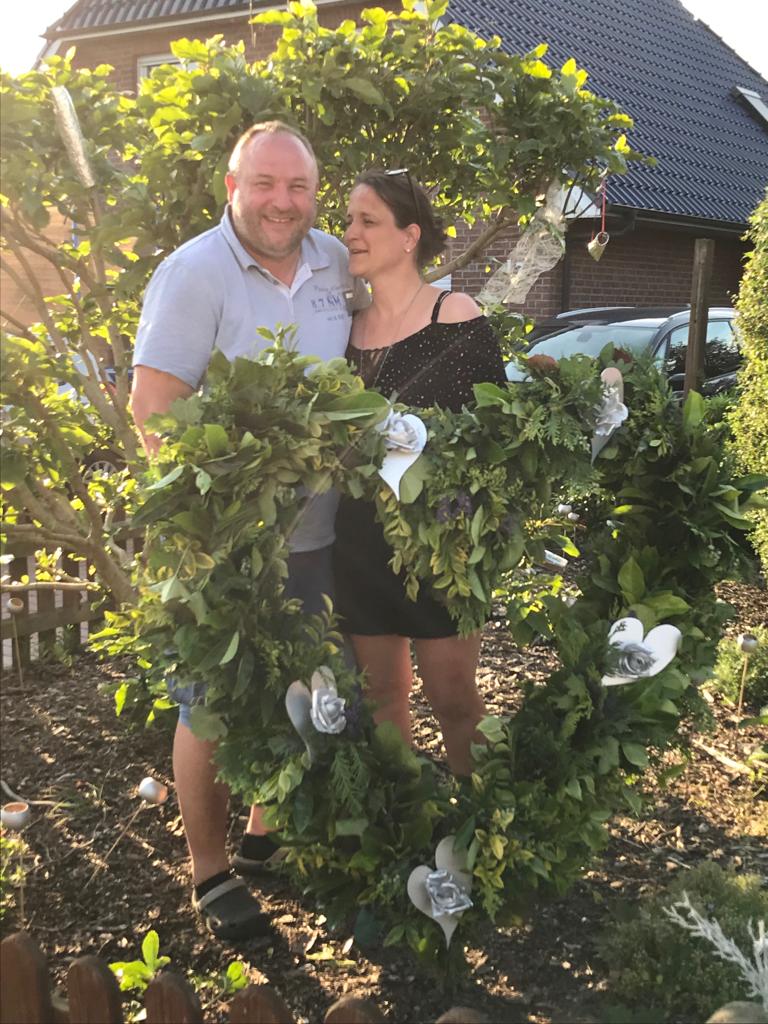 Trotz Corona bekamen Jocki & Birte zur Silberhochzeit einen Kranz. Erstellung und Übergabe erfolgten natürlich unter Einhaltung der erforderlichen Abstandsregeln. Das schmücken selber musste leider ausfallen, wird aber zur Perlenhochzeit nachgeholt.
