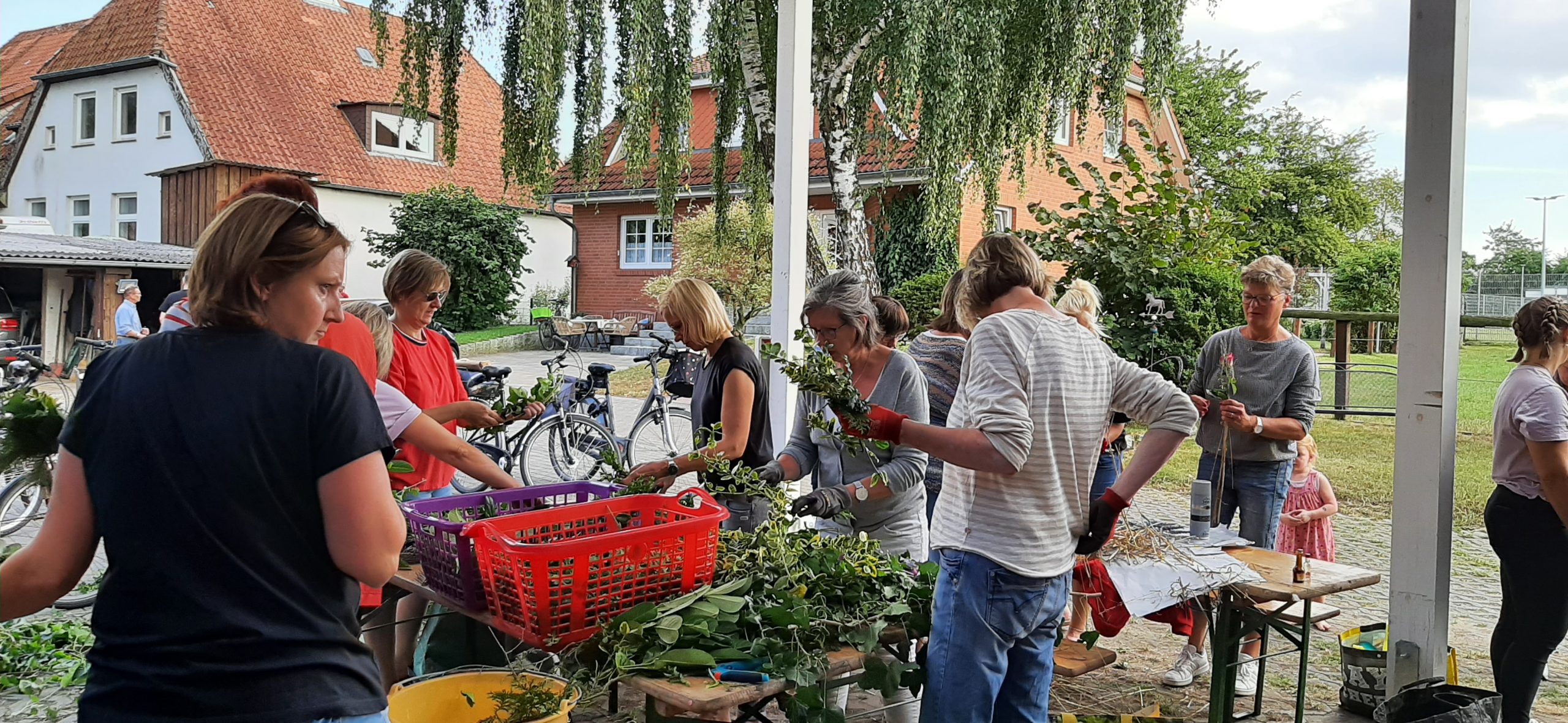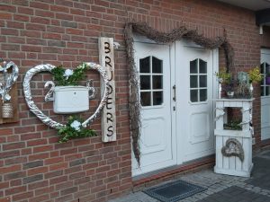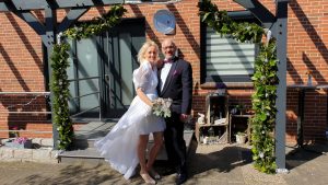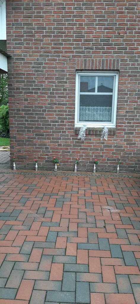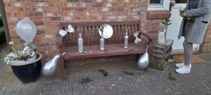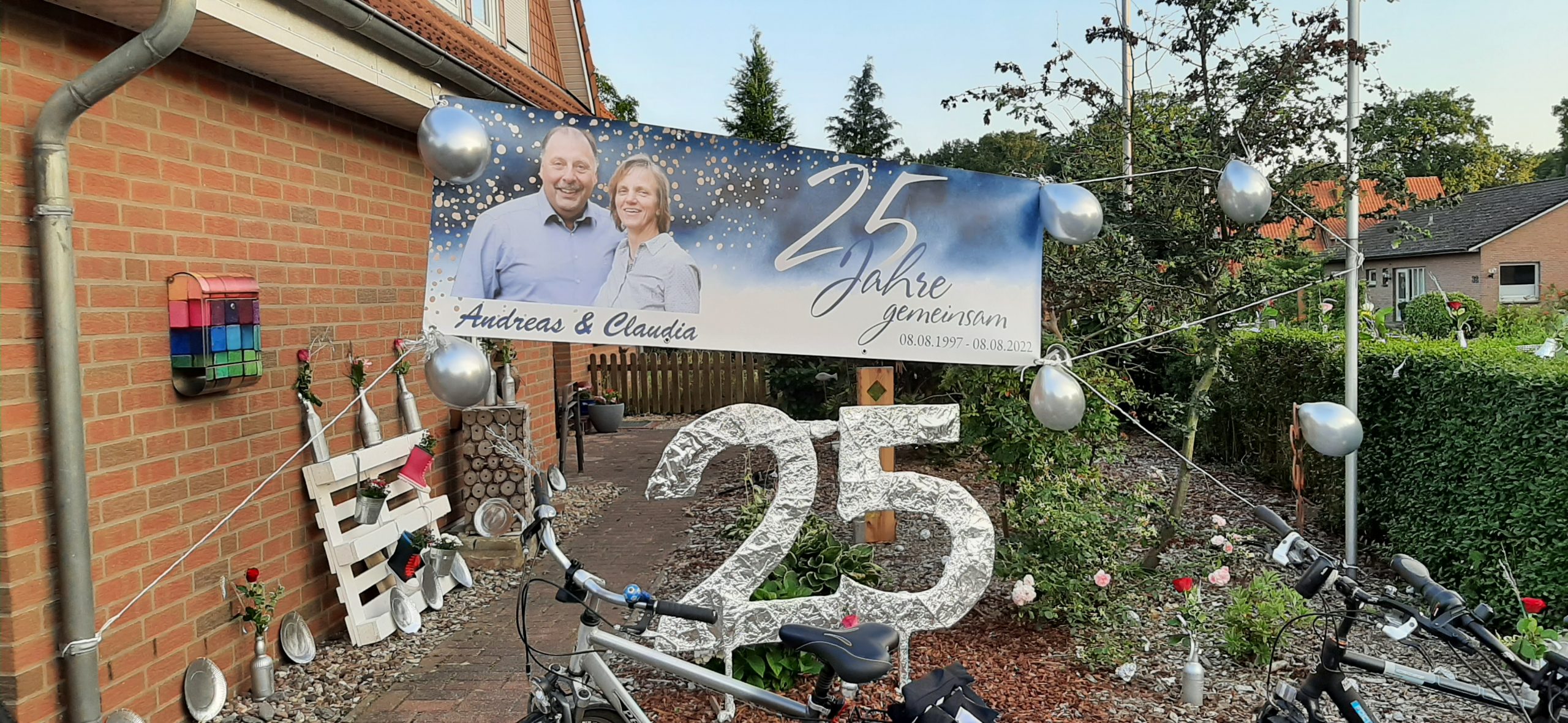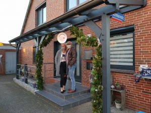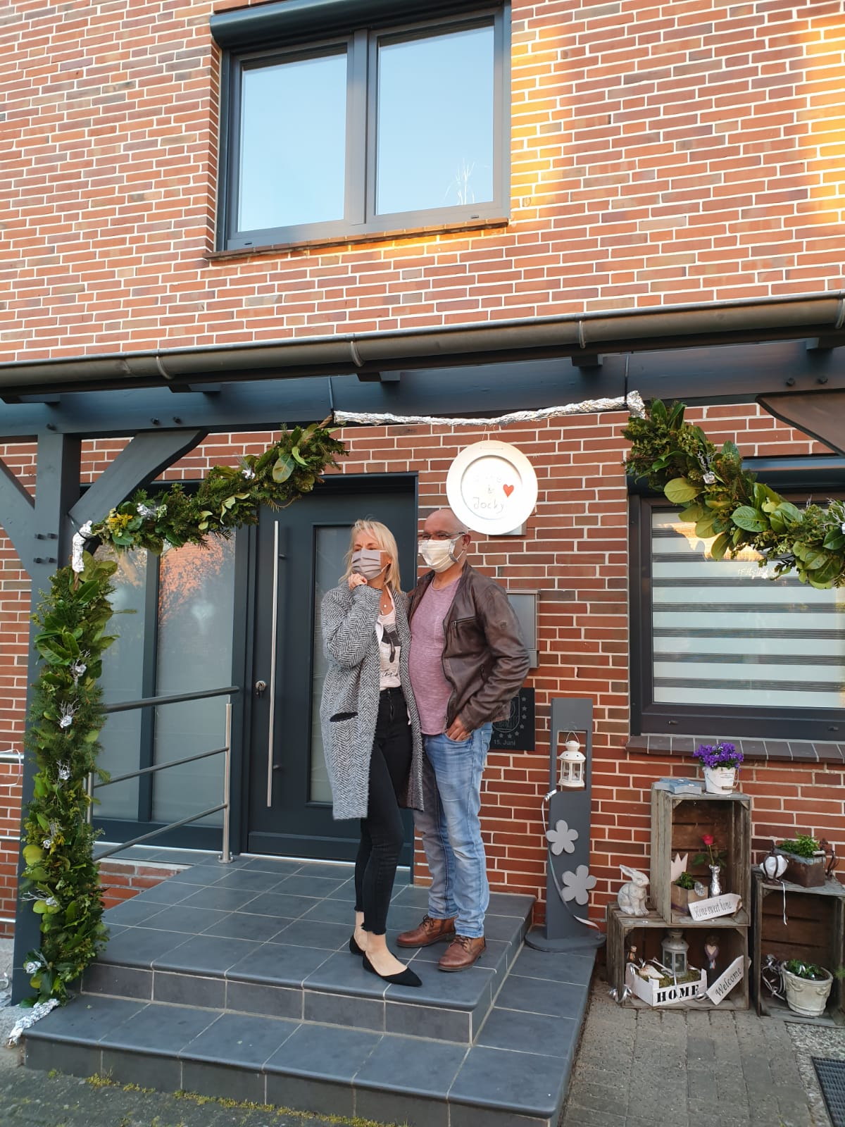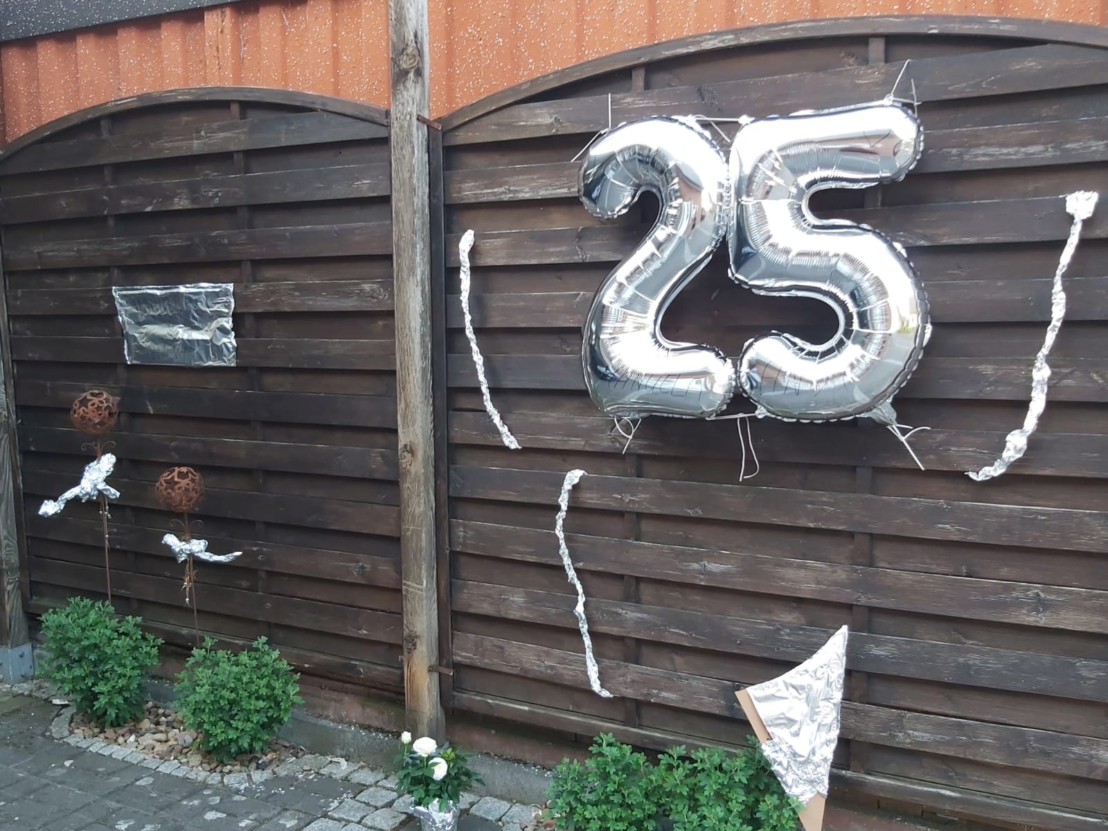Trotz Corona bekamen Jocki & Birte zur Silberhochzeit einen Kranz. Erstellung und Übergabe erfolgten natürlich unter Einhaltung der erforderlichen Abstandsregeln. Das schmücken selber musste leider ausfallen, wird aber zur Perlenhochzeit nachgeholt.